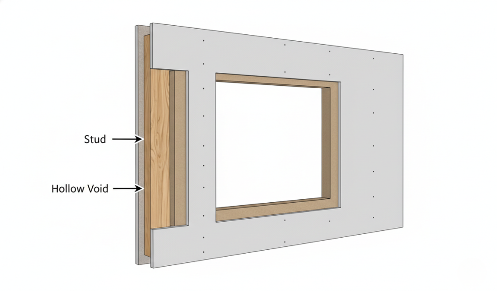 Most of your wall is actually empty air. This is the “void.” When you drill here, the only thing holding your screw is the 12.5mm thickness of the board. This is why specialized fixings are so important; they are designed to “anchor” themselves against the back of the board to prevent pulling out.