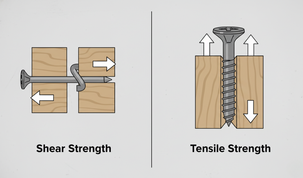 To act as an expert, we must talk about the “Big Two” of physics: Shear and Tensile strength. This is where the nail vs screw battle is truly fought.