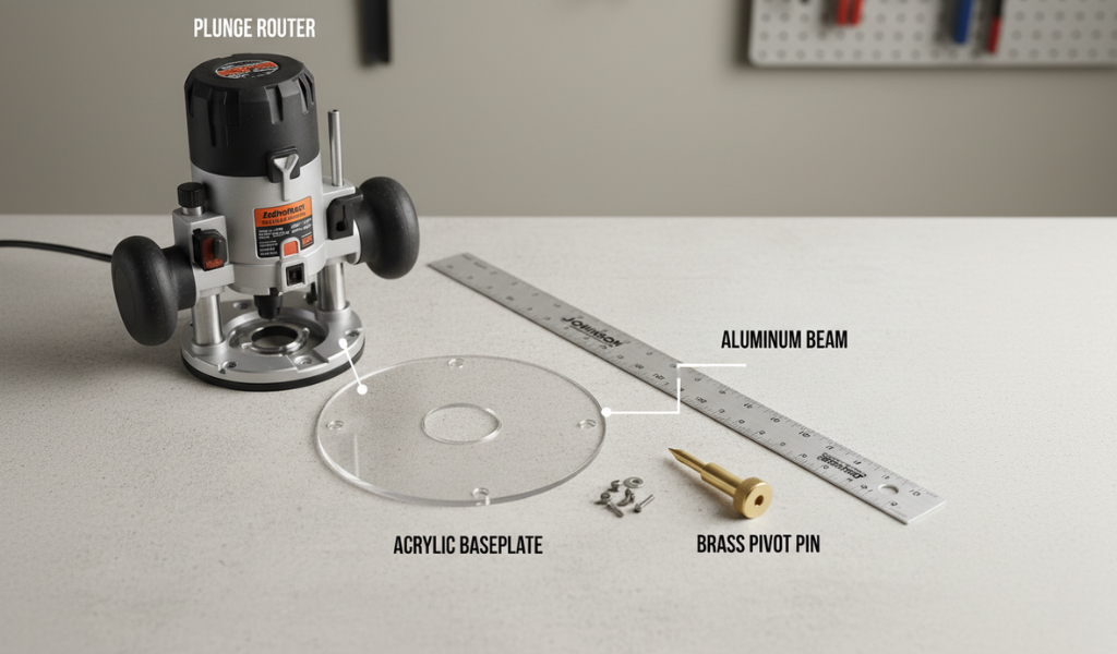 Attach the Beam: Secure your aluminum ruler or wooden arm to the baseplate. Ensure it is perfectly square to the center of the router collet.